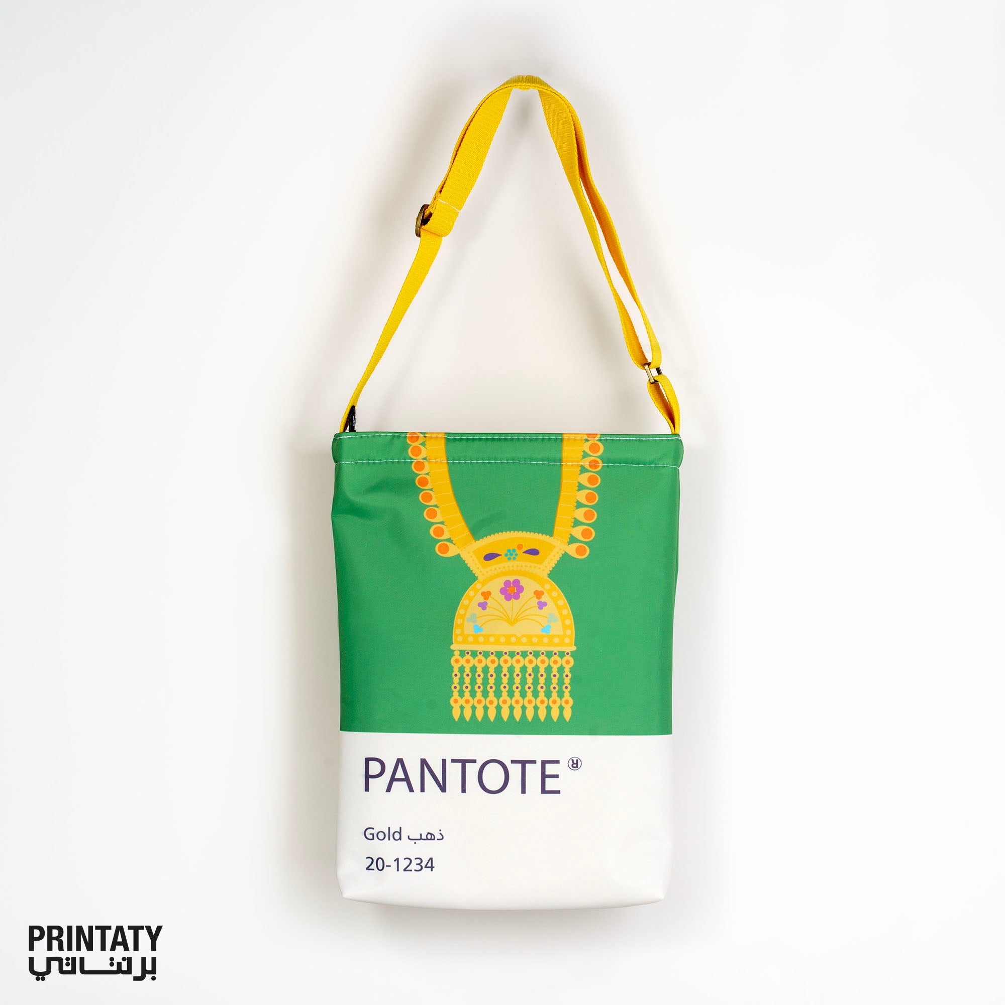 Gold jewelry was and still is an essential part of Qatari women's adornment in the past and present. Qatari and Gulf gold is characterized by distinctive shapes bearing different names. On this bag is an artwork inspired by Al-Ma'arri's necklace.