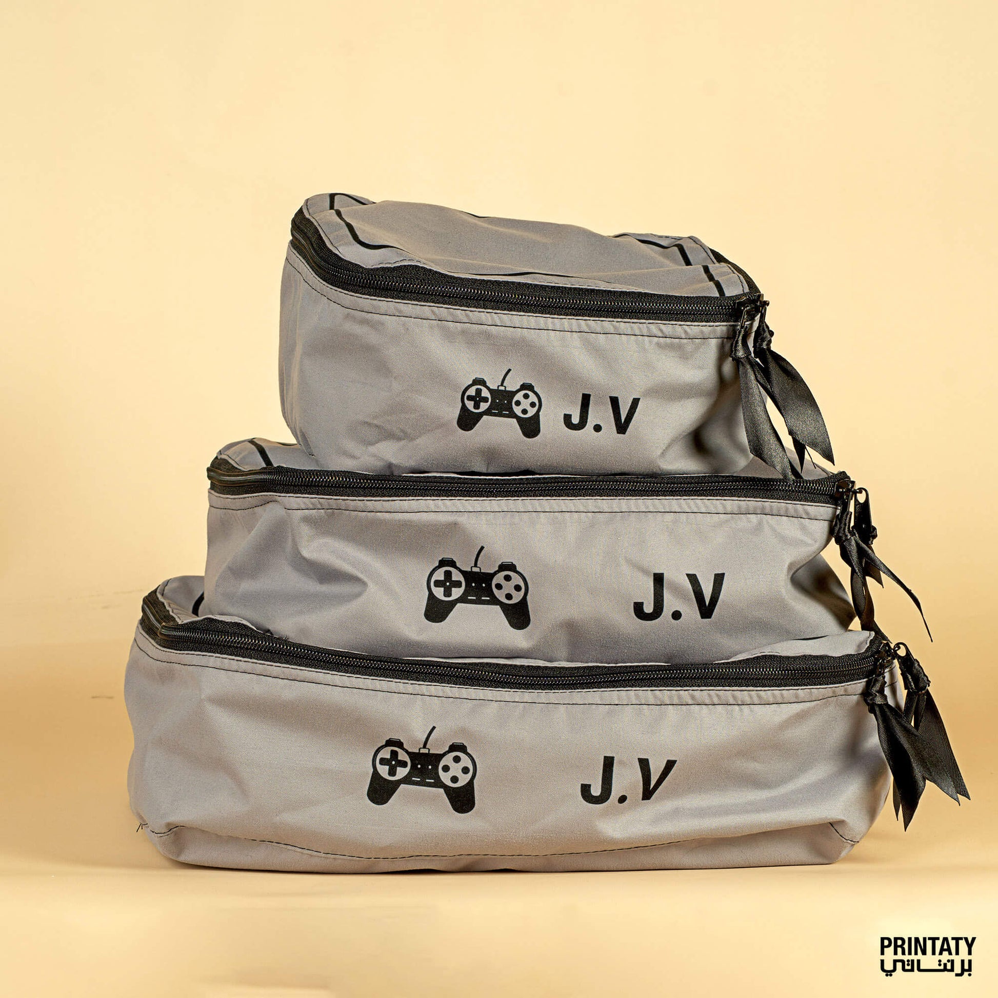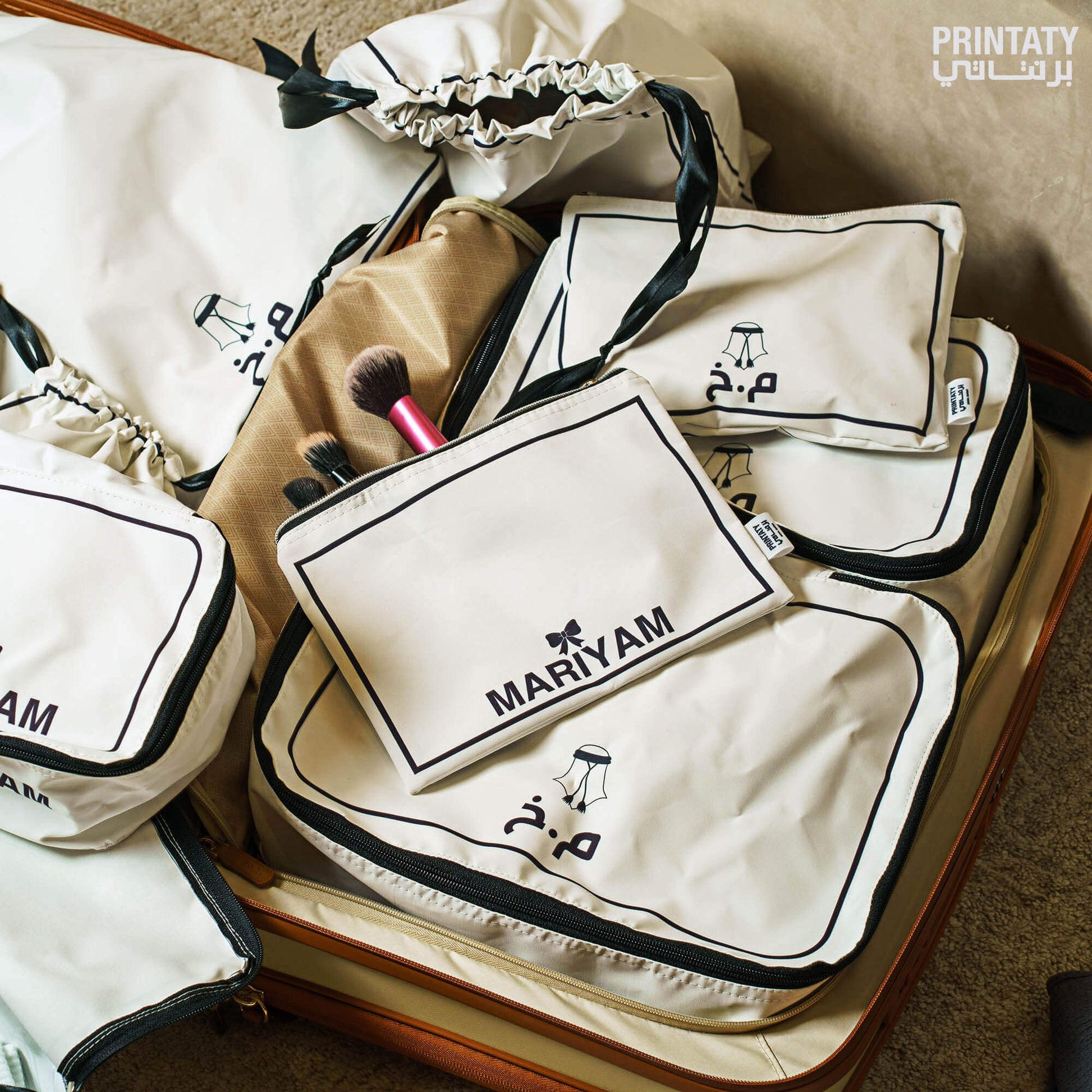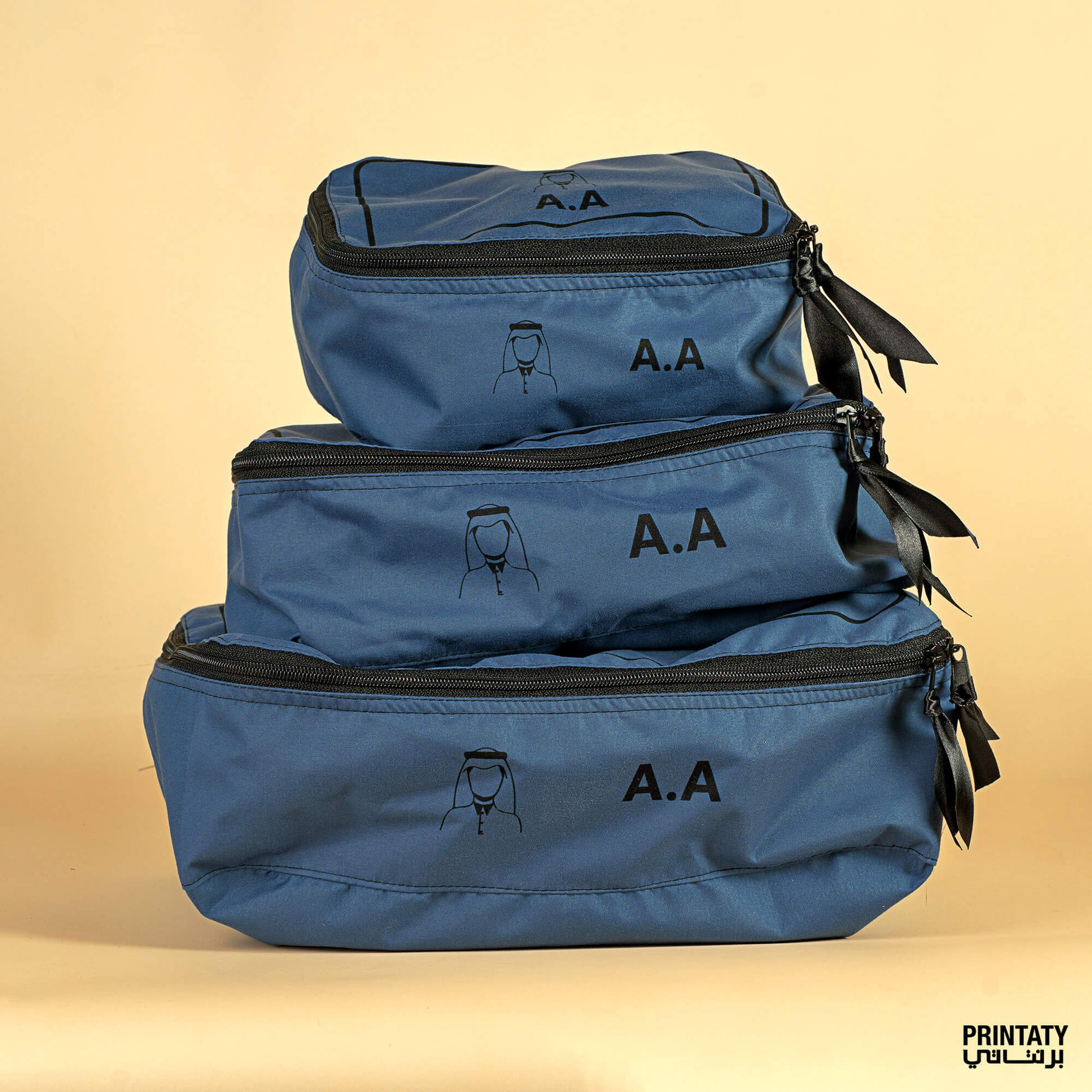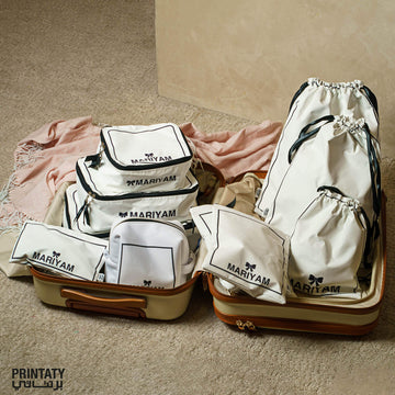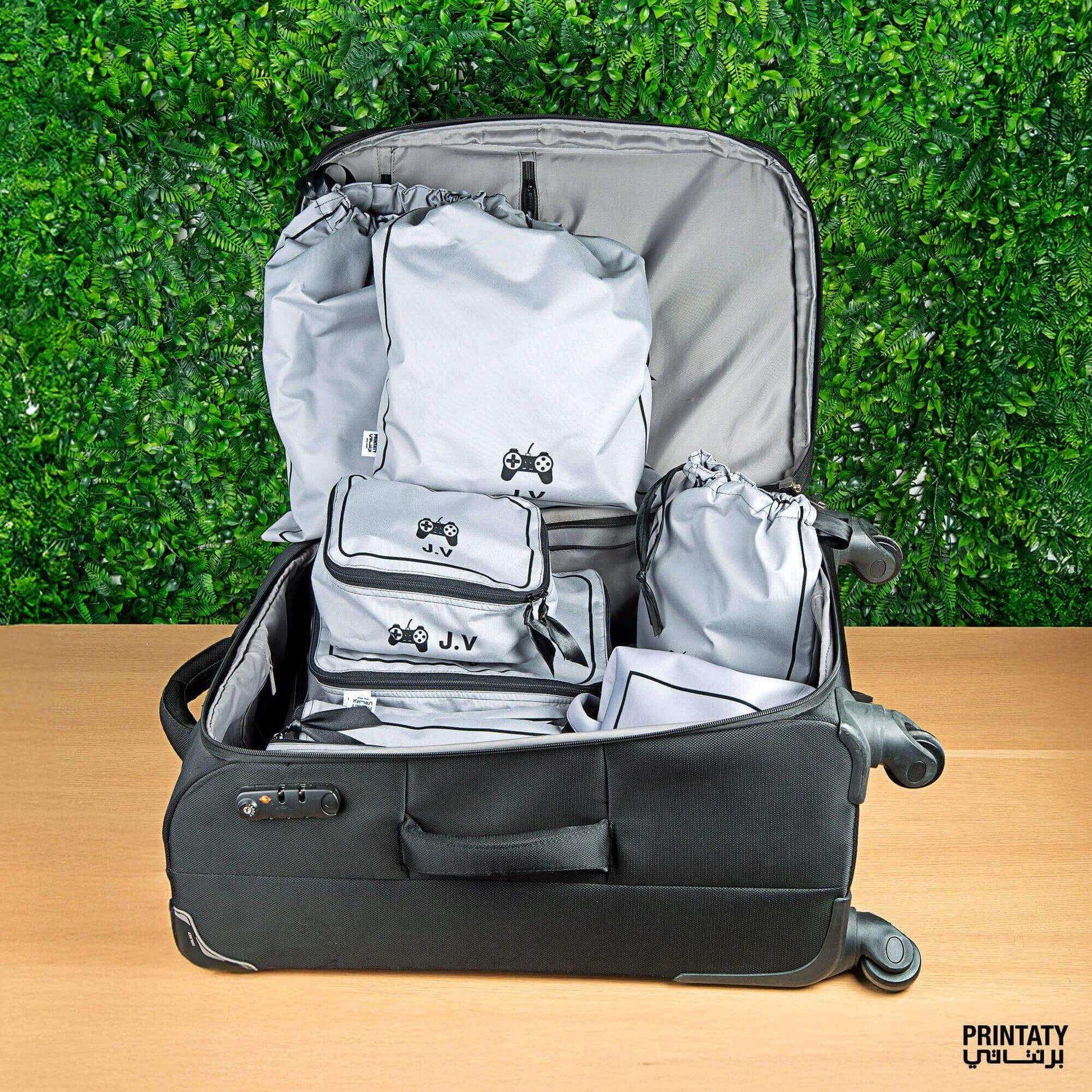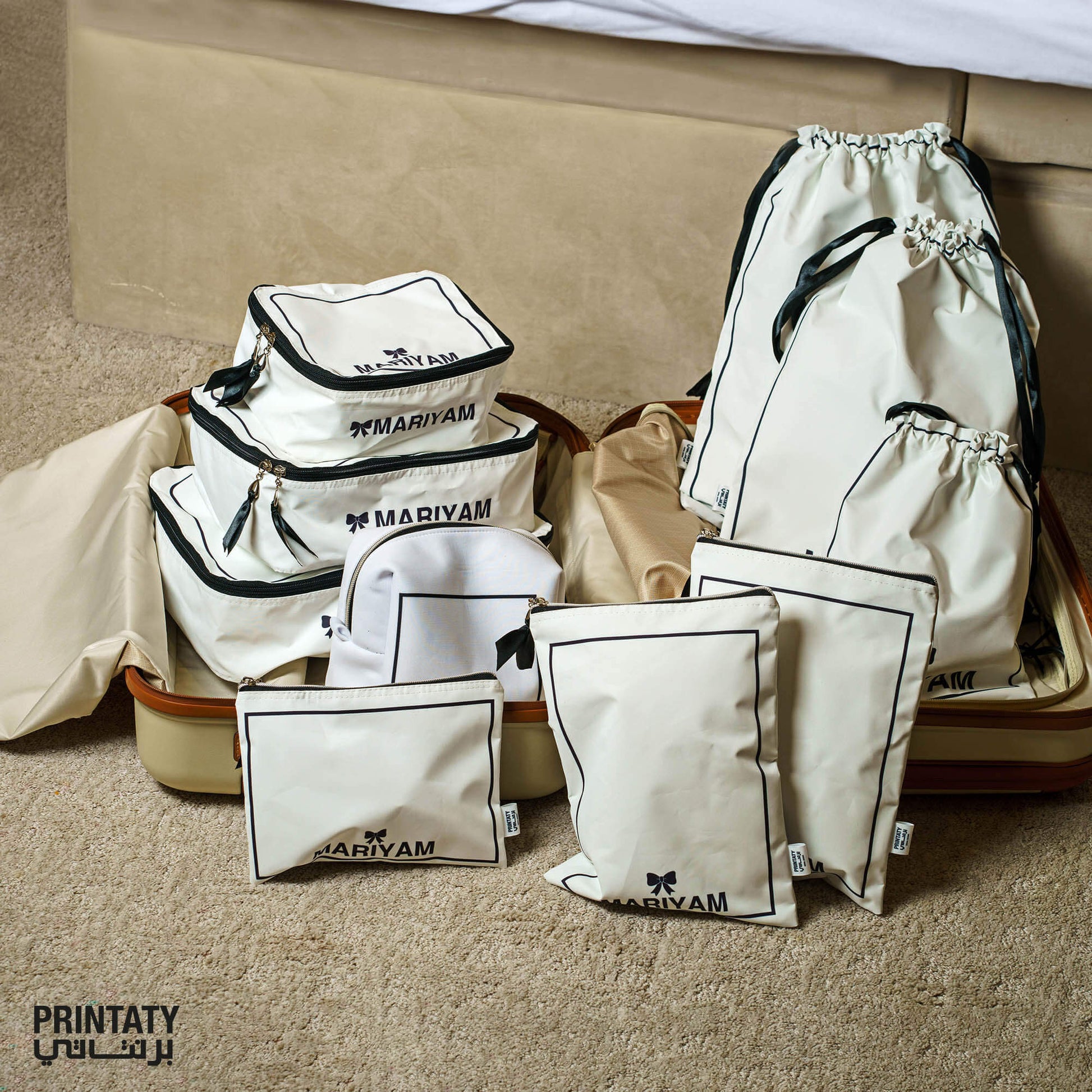 “مجموعة منتظمات سفر قماشية متعددة الأحجام بتصميم مخصص، تشمل منظمات شنط السفر وأكياس تنظيم السفر القماشية لحفظ الملابس والأغراض الشخصية داخل حقيبة السفر. متوفرة كمجموعتين ٥ قطع أو ١٠ قطع، وبخمسة ألوان مع إمكانية طباعة الاسم واختيار الايقونة. مثالية كحقائب قماش بطباعة الاسم أو أكياس ملابس للشنط وإكسسوارات سفر مخصصة لكل المسافرين.”