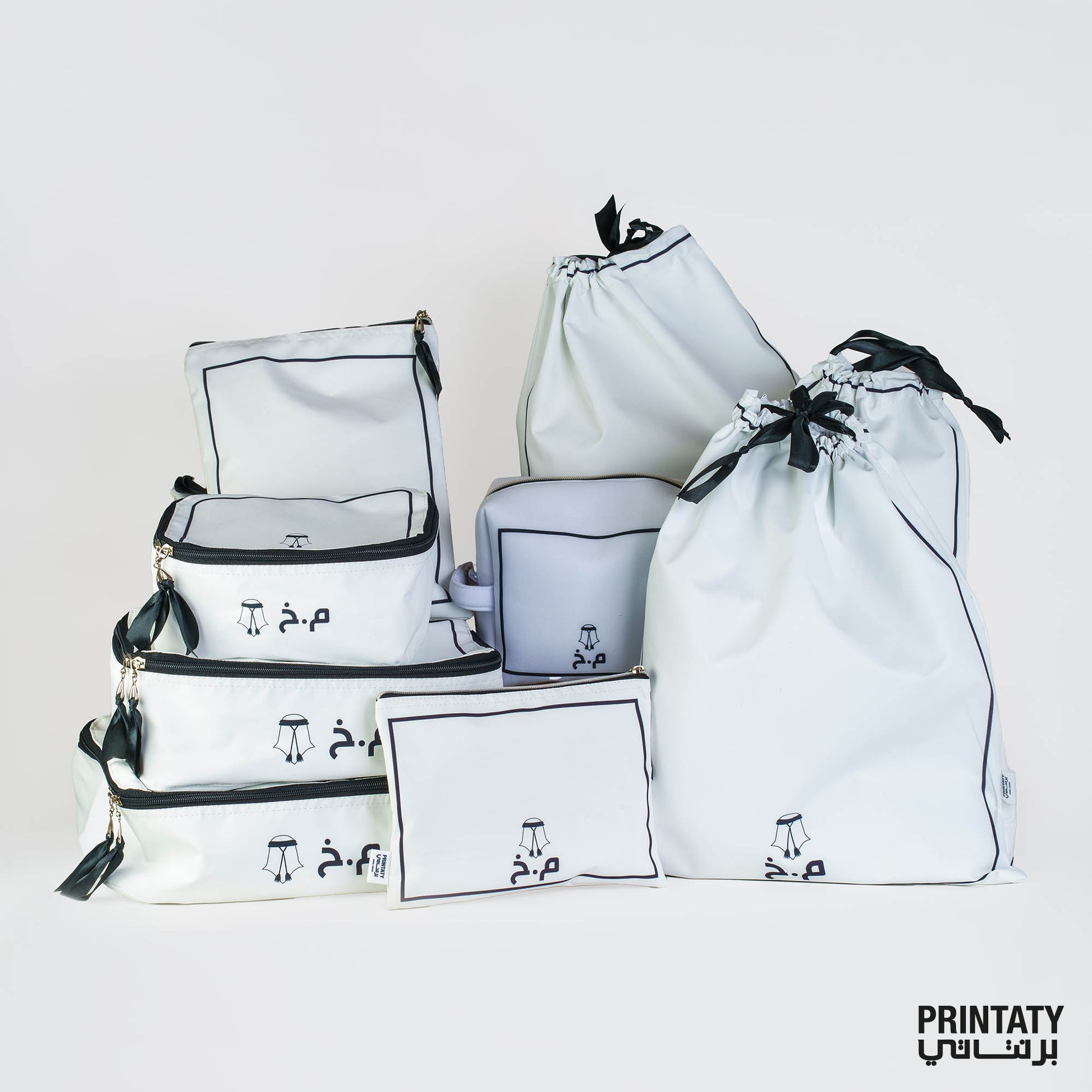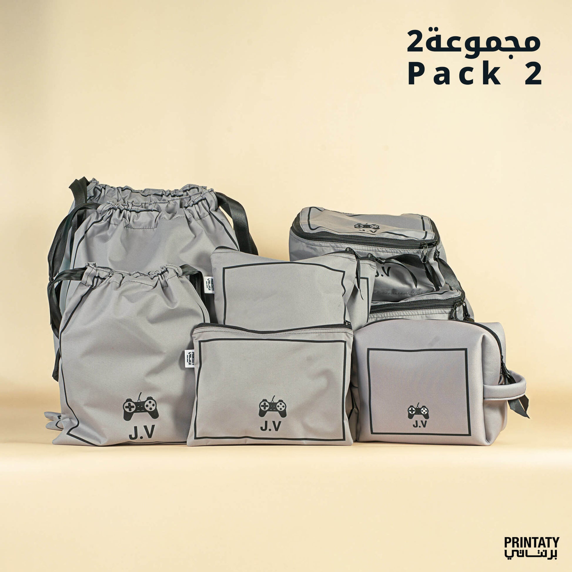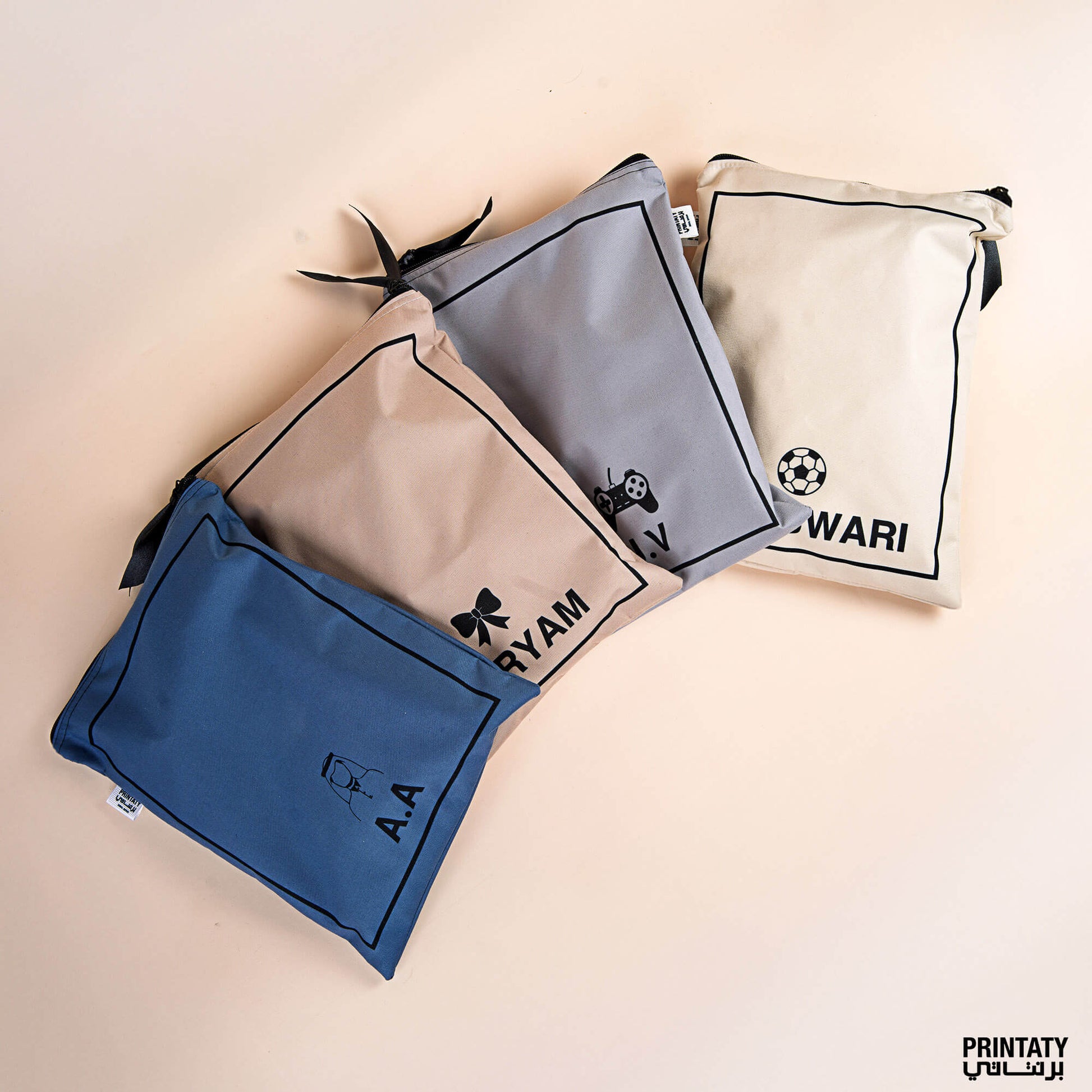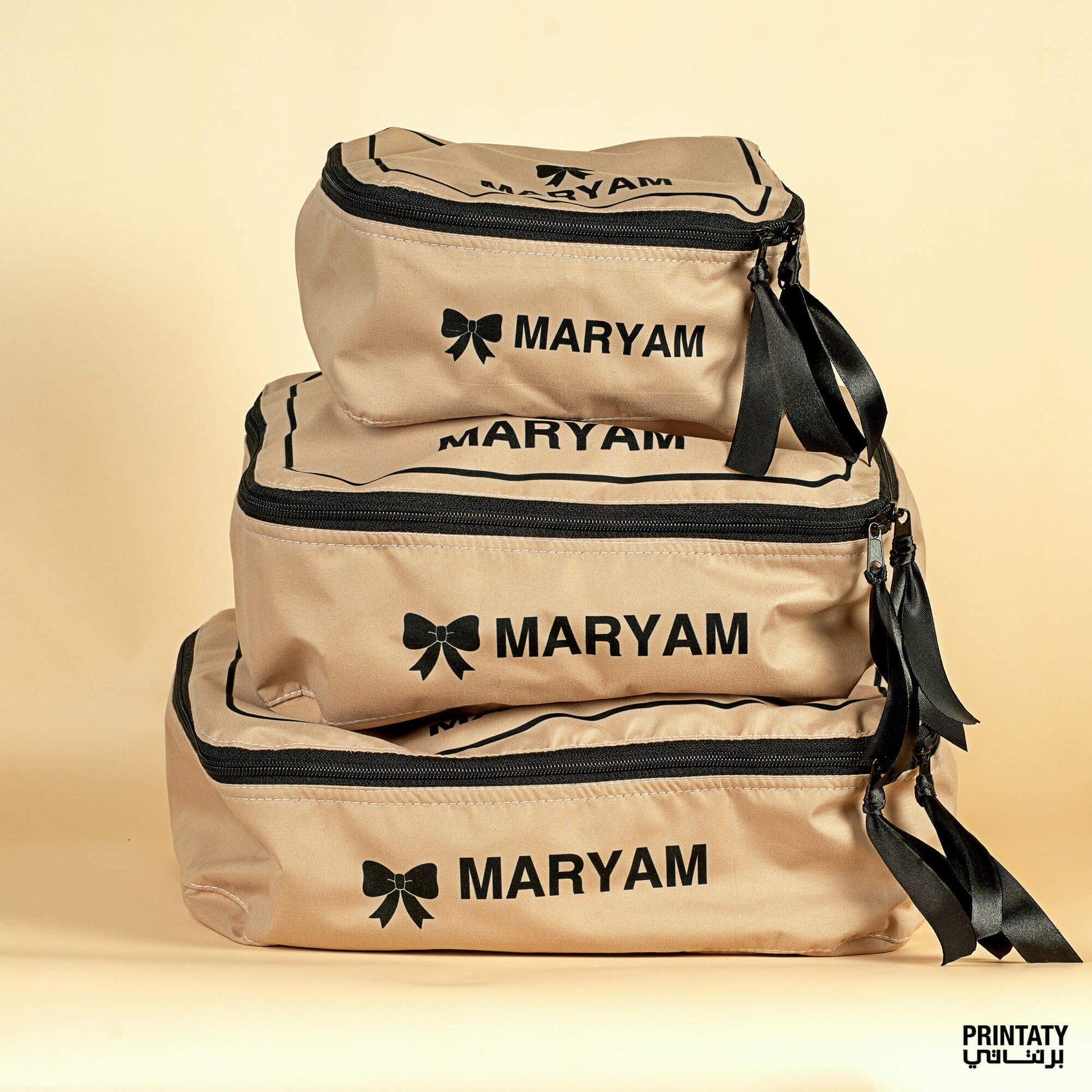 “مجموعة منتظمات سفر قماشية متعددة الأحجام بتصميم مخصص، تشمل منظمات شنط السفر وأكياس تنظيم السفر القماشية لحفظ الملابس والأغراض الشخصية داخل حقيبة السفر. متوفرة كمجموعتين ٥ قطع أو ١٠ قطع، وبخمسة ألوان مع إمكانية طباعة الاسم واختيار الايقونة. مثالية كحقائب قماش بطباعة الاسم أو أكياس ملابس للشنط وإكسسوارات سفر مخصصة لكل المسافرين.”
